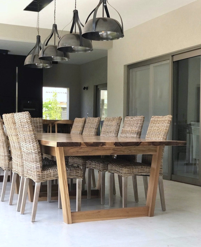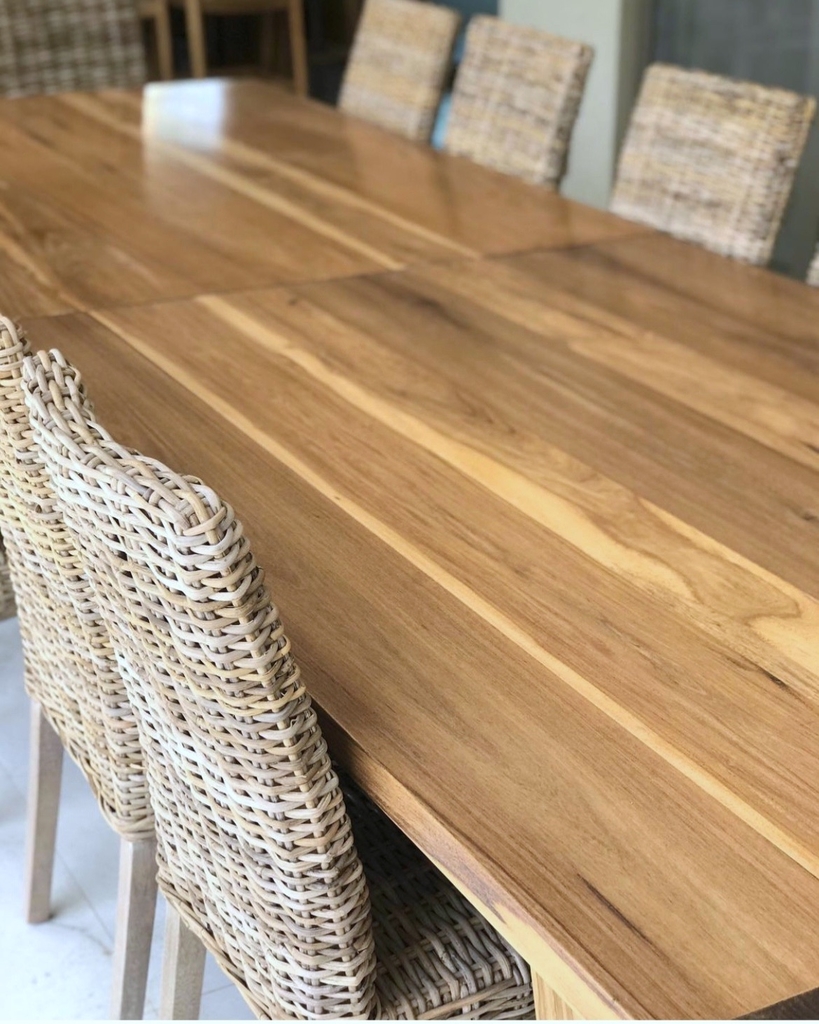 Descripcion: mesa realizada en petiribi, base maciza y tapa en petiribi opcional (enchapada o maciza). El espesor de la tapa en ambos casos es de 3cm hasta 1.80 de largo y a partir de los 2.00 mts es de 4cm de espesor (2 pulgadas). Terminacion con hidrolaca.